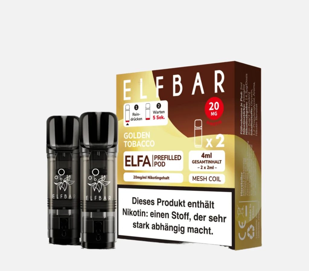 - 2× vorbefüllte Elfbar Elfa Pods – Geschmack: Golden Tobacco.