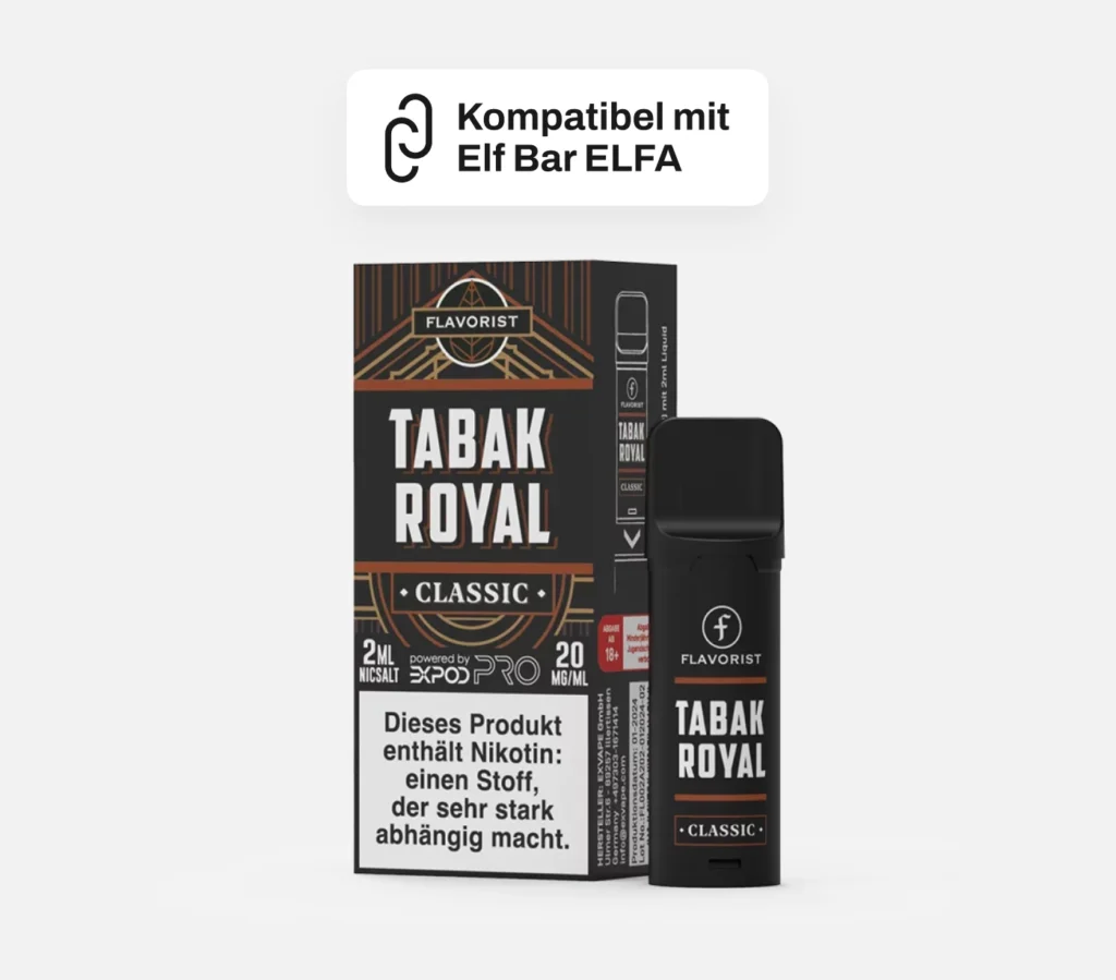 - Tabak Royal: Ein edler, sanft würziger Tabakgeschmack mit einer leicht süßen Note. Ideal für Liebhaber klassischer Tabakprofile – ausgewogen, rund und stilvoll.