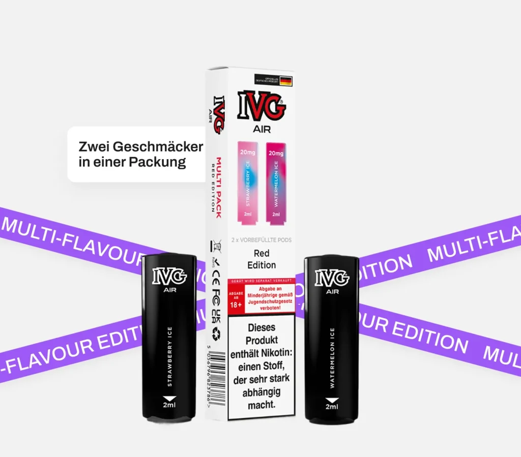 Erleben Sie die Vielfalt der IVG Air Pods – die perfekte Ergänzung für Ihr IVG Air Akku Pod System! Jede 2-ml-Kapsel ist mit hochwertigem Nikotinsalz-Liquid (20 mg) gefüllt und sorgt dank der modernen Mesh-Coil-Technologie für einen intensiven Geschmack und dichten Dampf. Die auslaufsicheren Pods garantieren ein reibungsloses Dampferlebnis mit bis zu 600 Zügen pro Pod.